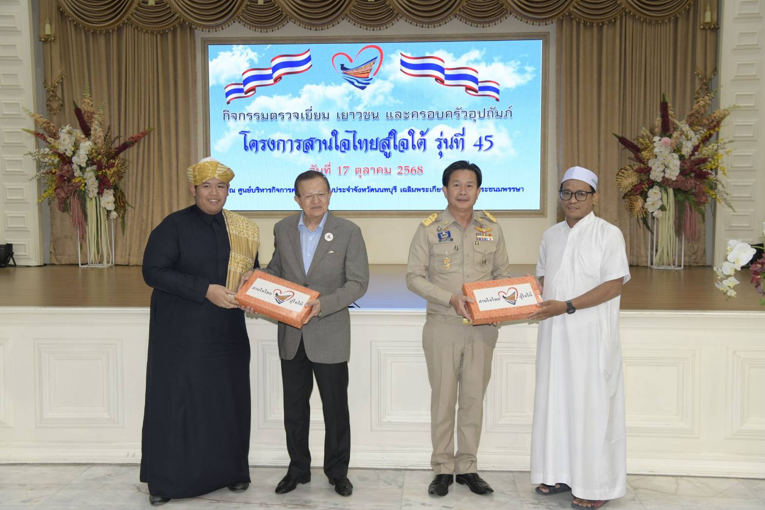 นนทบุรี-ต้อนรับคณะกรรมการตรวจเยี่ยมโครงการ “สานใจไทย สู่ใจใต้” รุ่นที่ ๔๕ เมื่อวันที่ ๑๗ ตุลาคม ๒๕๖๘ เวลา ๑๔.๓๐ น. ณ ศูนย์บริหารกิจการศาสนาอิสลามประจำจังหวัดนนทบุรี ตำบลละหาร อำเภอบางบัวทอง จังหวัดนนทบุรี นายอารีย์ วงศ์อารยะ ประธานกรรมการบริหารมูลนิธิฯ เป็นประธานตรวจเยี่ยมโครงการ “สานใจไทย สู่ใจใต้” รุ่นที่ ๔๕